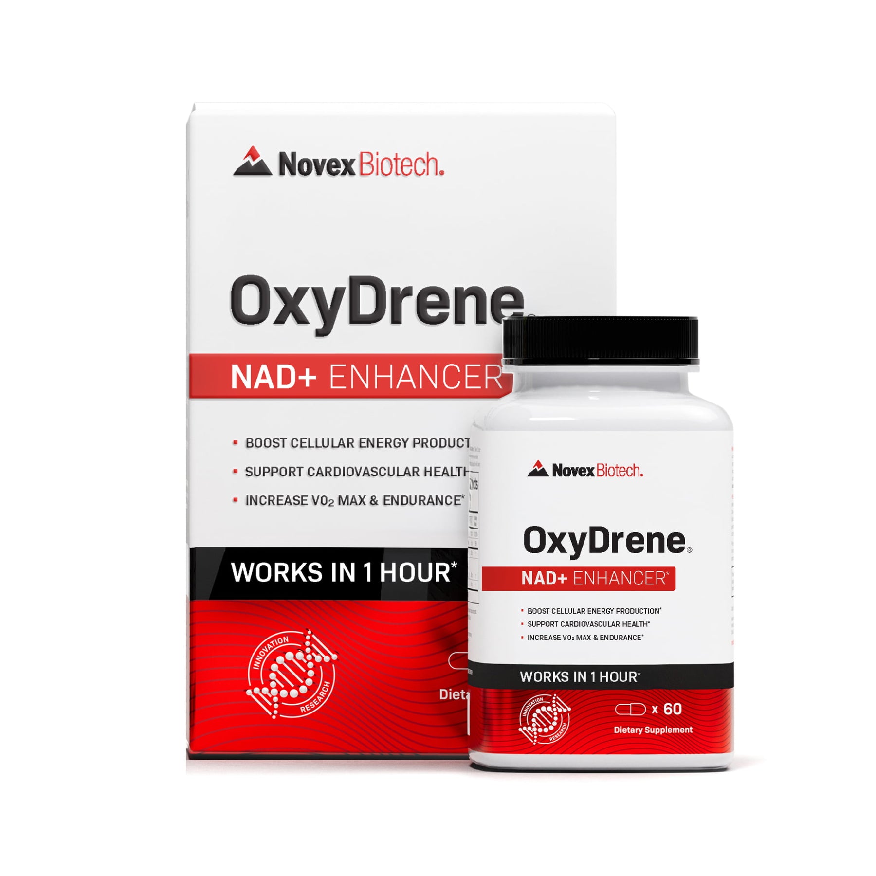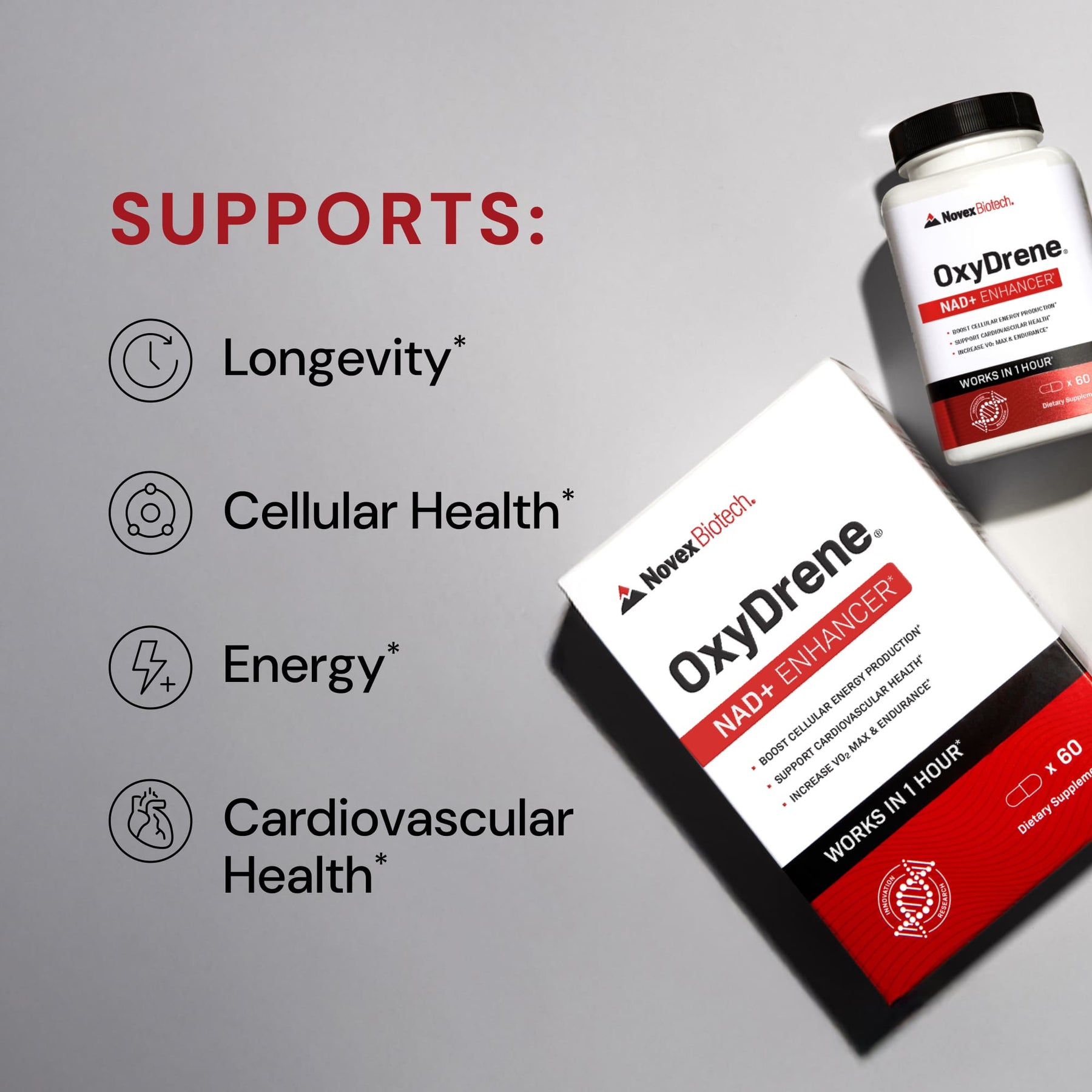 Novex Biotech OxyDrene supplement bottle and packaging on a gray background with benefits listed.